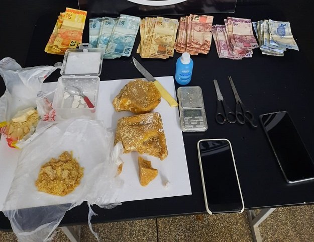 Durante a realização das buscas houve a localização de grande quantidade de drogas (pasta base de cocaína e cocaína pura) no interior da residência, além de aparelho de telefone celular, balança de precisão e R$ 2.522,00 provenientes do tráfico de drogas.