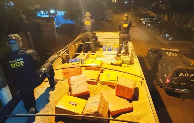 Policiais do DOF (Departamento de Operações de Fronteira) apreenderam 7,2 toneladas de maconha nesta quarta-feira (27) na linha internacional com o Paraguai. A droga dividida em fardos estava camuflada em carga de farelo de soja transportada em uma carreta Scania.