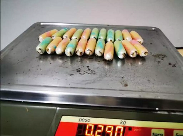 Durante a revista, os policiais encontraram 22 cápsulas da droga na bagagem dos suspeitos. Diante do flagrante, eles confessaram que um deles havia engolido 80 cápsulas e o outro 60 cápsulas, para tentar despistar a fiscalização.