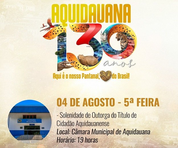 Nesse evento a Câmara Municipal de Aquidauana fará a entrega do Título de Cidadão e Cidadã Aquidauanense homenageando personalidades não nascidas em Aquidauana e que ao longo dos anos prestaram relevantes serviços ao Município.