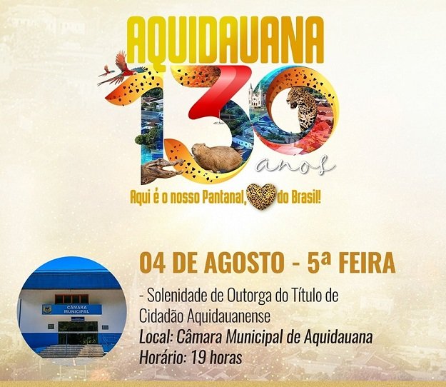 Nesse evento a Câmara Municipal de Aquidauana fará a entrega do Título de Cidadão e Cidadã Aquidauanense homenageando personalidades não nascidas em Aquidauana e que ao longo dos anos prestaram relevantes serviços ao Município.