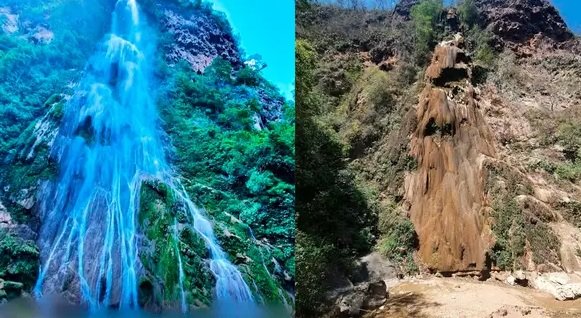 Montagem do antes e do depois com fotos da maior cacheira do Estado, Boca da Onça. (Foto: Instagram e Cristian Piana)