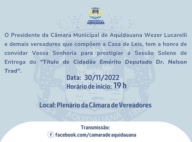 O evento aberto ao público e convidados será realizado no Plenário Estevão Alves Corrêa, com início previsto para às 19 horas com transmissão ao vivo através rede social da Câmara Municipal de Aquidauana.
