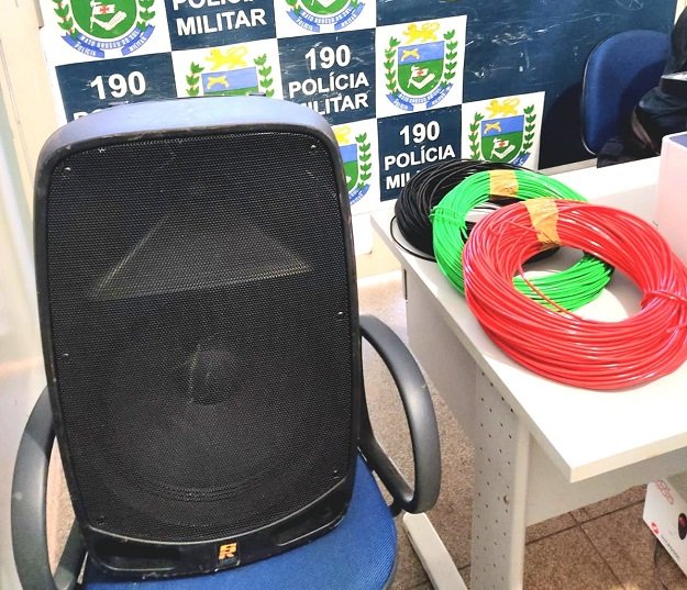No local foram encontrados três rolos de fios de elétricos e uma caixa de som, dentro de um saco preto, abandonados embaixo de uma árvore, os suspeitos não estavam mais no local.