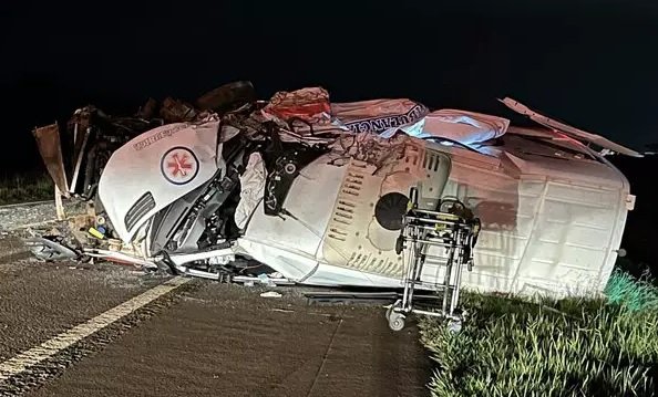Ambulância ficou destruída e tombada na pista após batida. (Foto: Marco Tomé | Região News)