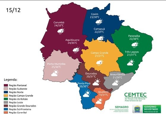 O tempo segue abafado em todas as regiões, e as temperaturas podem passar dos 35°C. São esperadas temperaturas mínimas entre 19/20°C e máximas de até 31°C na região sul. Na região norte, mínimas entre 21/24°C e máximas de até 35°C. Em Campo Grande, mínima de 21°C e máxima de 31°C.