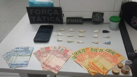No pote, foram encontradas 12 porções de pasta base de cocaína, além de R$ 305,90. O autor foi encaminhado para a delegacia e para o hospital, para realizar exame de corpo de delito.