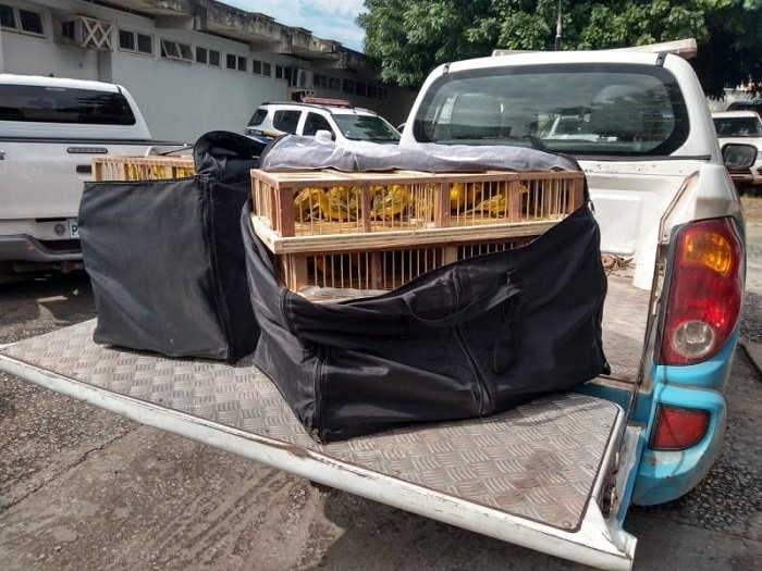 As aves, que não são da fauna brasileira, e as gaiolas foram apreendidas.