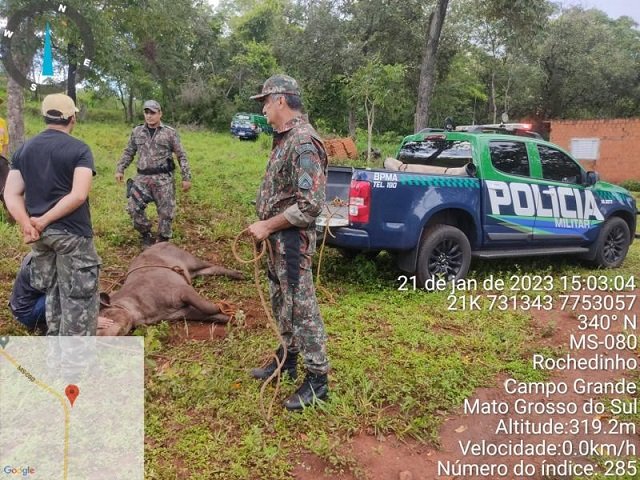 Policiais Militares Ambientais de Campo Grande, Militares do Corpo de Bombeiros e médica veterinária do Centro de Reabilitação de Animais Silvestres (CRAS) realizaram o resgate de uma anta atropelada à margem da rodovia MS 080 hoje (21).