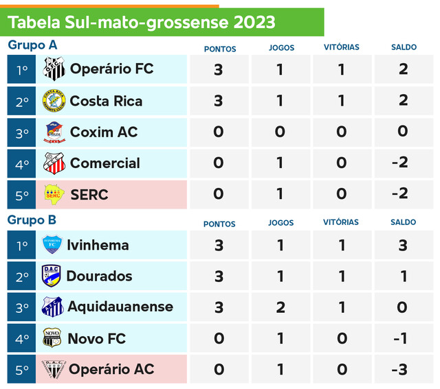 No fim de semana são quatro jogos marcados, todos para domingo, às 15h. As disputas serão entre Operário x Costa Rica, Coxim x Serc, Ivinhema x Dourados e Operário Atlético de Caarapó x Aquidauanense.