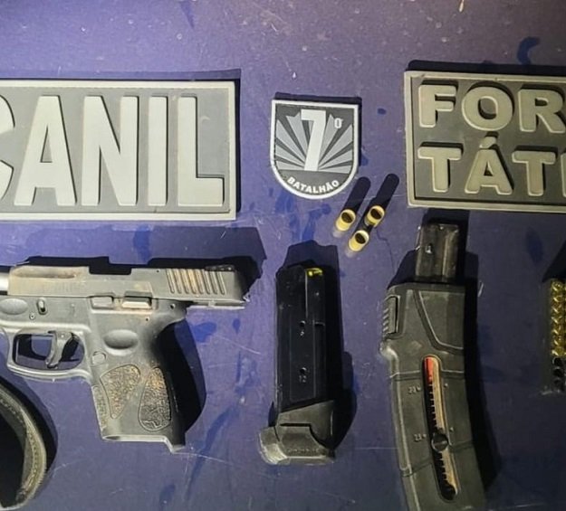 Após busca minuciosa no veículo e aos arredores, encontraram uma pistola modelo PT G2/ TAURUS, 50 (cinquenta) munições calibre 22 e 01 (um) carregador de fuzil.