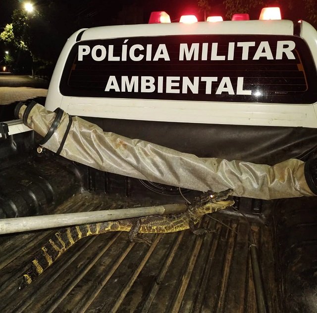 Um morador (30) da região acionou a PMA ontem (16) às 21h35, informando que o animal silvestre da espécie Caiman yacare estava transitando pela rua em frente de sua residência.