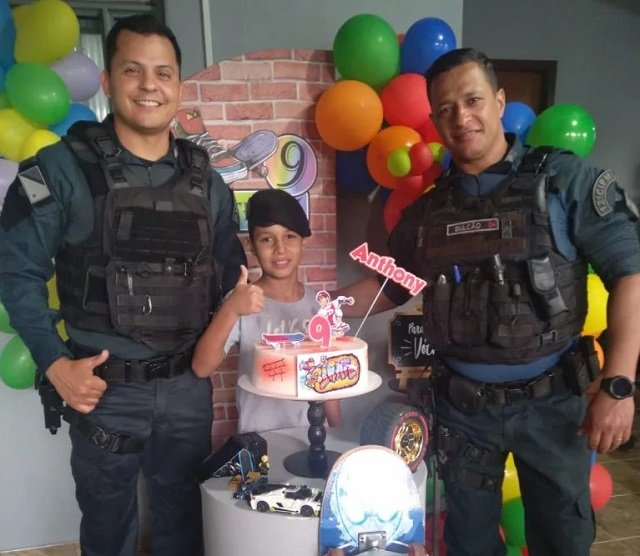 Assim, os policiais realizaram este policiamento comunitário comparecendo neste sábado na residência, onde ocorreu a festa de aniversário, para conhecer Anthony e a felicitar pelo seu aniversário.