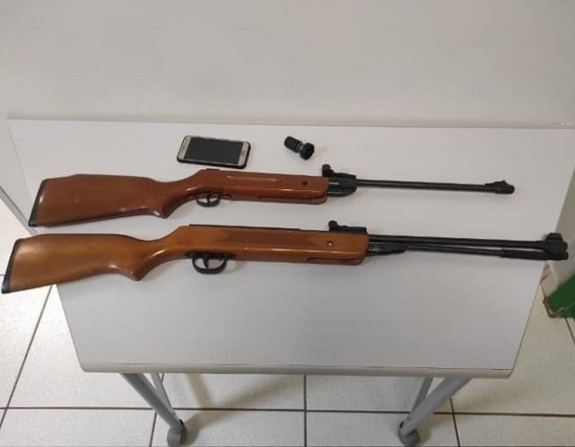 Foi identificado e qualificado esse senhor e diligenciado até a sua residência. No local ele foi indagado a respeito da arma que segurava no momento do delito e ele apresentou as duas armas, sendo as duas de pressão, mas uma delas estava modificada para utilizar munição .22.