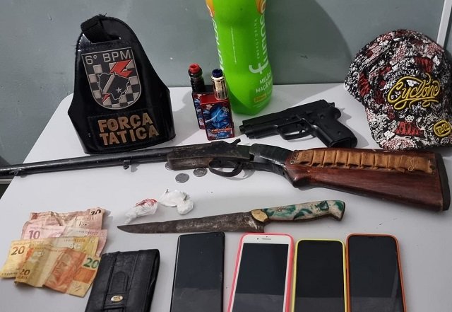 Após busca pessoal nos indivíduos, foram encontradas no bolso da calça de um deles (18) duas trouxinhas de substância análoga à cocaína e uma quantia de R$ 70,00 (setenta reais). Também foi constatado que um dos integrantes do grupo era o indivíduo (18) identificado pela comunicante momentos antes. No interior do veículo, foi localizada uma espingarda, um simulacro (arma de brinquedo) e uma faca.