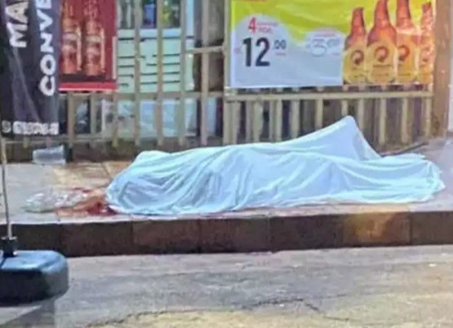 Corpo de Gabriel caído em frente ao bar onde foi executado. (Foto: Direto das Ruas)