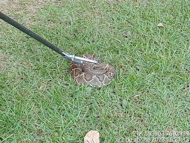 Uma serpente da espécie Crotalus durissus (cascavel) foi capturada ontem (22) no final da tarde, por Policiais Militares Ambientais de Bonito, depois de serem acionados pelo funcionário de um hotel, localizado no bairro Jardim Andrea, que informava sobre a presença da serpente que estaria no gramado do jardim do hotel.