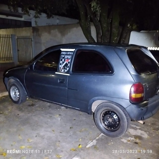 No domingo, dia 28/05, a equipe de FORÇA TÁTICA, foi informada que nas imediações da vila Previsul estaria trafegando um veículo que seria produto de furto na cidade de Campo Grande no mês de dezembro de 2022, encontrou o referido veículo, cito um CORSA WIND de cor CINZA.