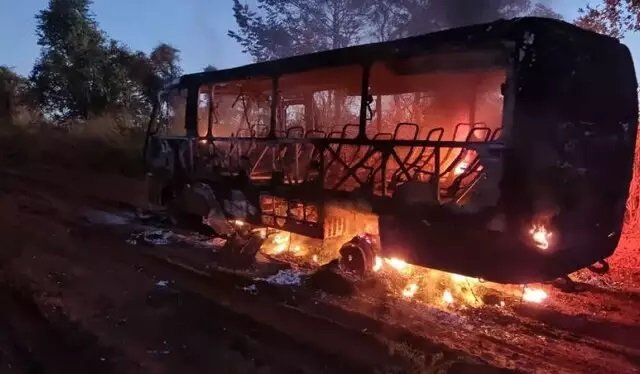 Ônibus escolar é destruído em incêndio em rodovia estadual