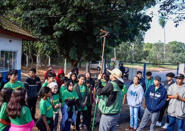 Logo após, seguiram para uma aula-passeio com o biólogo da SEMA, Dr. Fernando Ibanez Martins, o qual apresentou as aves, animais e plantas existentes no Parque Municipal da Lagoa Comprida e, ainda, mostrou a revoada de Araras.
