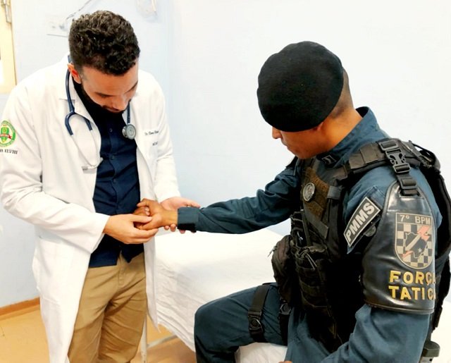 No Pronto Socorro do Hospital Regional de Aquidauana, o polilcial militar foi submetido a um exame de raio x , sendo constatada uma luxação em sua mão direita. Ele passou por avaliação com o médico ortopedista e foi liberado.