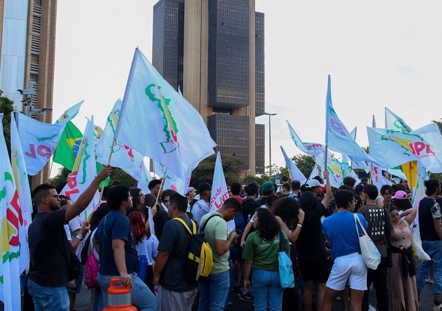 Milhares de participantes do 59ª Congresso Nacional da União Nacional dos Estudantes (UNE) protestaram, nesta sexta-feira (14), em frente ao prédio do Banco Central (BC), em Brasília, pedindo a queda da taxa básica de juros, a Selic.