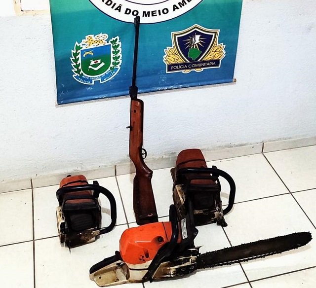 Em virtude disso, a equipe realizou a vistoria do material que estava na carroceria e encontrou uma arma de fogo artesanal calibre .22 e três motosserras sem a Licença de Porte e Uso – LPU.
