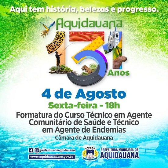 No próximo dia 04, dentro das comemorações alusivas aos 131 anos de Aquidauana, na Câmara Municipal de Aquidauana, acontecerá a formatura do Curso Técnico em Agente Comunitário de Saúde e em Vigilância em saúde com Ênfase no Combate às Endemias.
