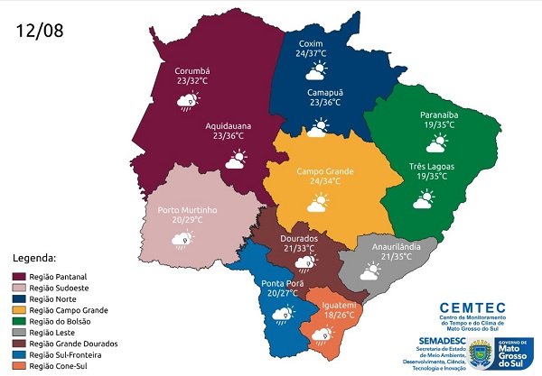 Em Corumbá, na região pantaneira, mínima de 23°C e máxima de 32°C; Aquidauana terá variação entre 23°C e 36°C. No sudoeste, onde pode ocorrer chuvas, Porto Murtinho amanhece com 20°C e atinge os 29°C ao longo do dia. No norte, Coxim com mínima de 24°C e máxima de 37°C. No Bolsão, Três Lagoas registra 19°C pela manhã e 35°C de tarde.