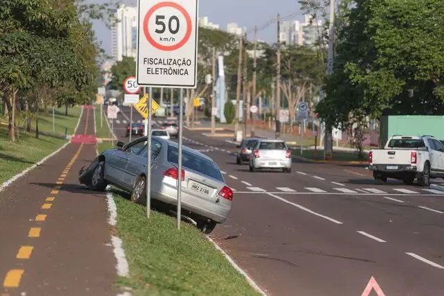 Na manhã desta quarta-feira (23), carro Honda Civic foi parar no canteiro central da Avenida Afonso Pena, após uma camionete Chevrolet S-10 invadir a pista.
