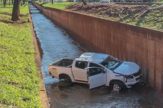 Na manhã deste domingo (10), uma camionete Chevrolet S-10 caiu dentro do córrego Segredo, na Avenida Ernesto Geisel.