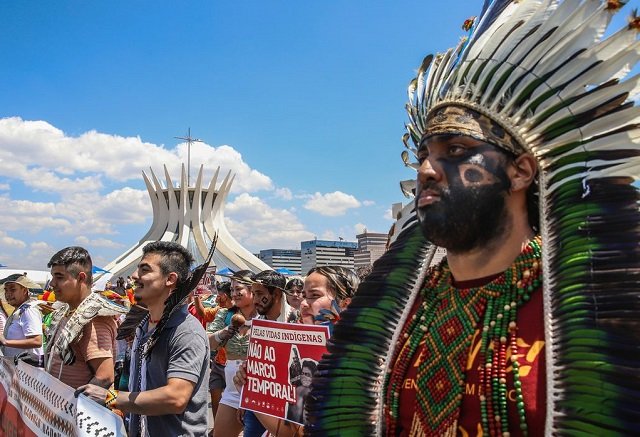 Para acompanhar o julgamento no STF, indígenas estão mobilizados em Brasília. Eles também se manifestam contra a tentativa do Senado de legalizar o marco temporal.