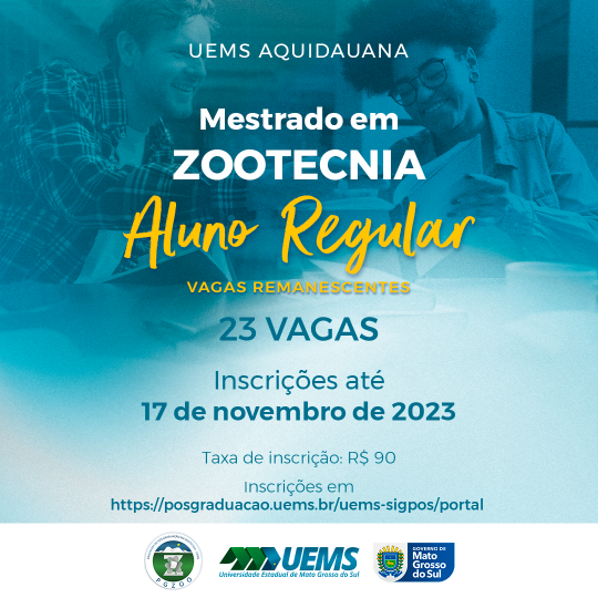 O Mestrado em Zootecnia da Universidade Estadual de Mato Grosso do Sul (UEMS), unidade de Aquidauana, está com inscrições abertas do processo seletivo de vagas remanescentes para ALUNO REGULAR do Programa de Pós-Graduação stricto sensu em Zootecnia – área de concentração Produção Animal no Cerrado-Pantanal da UEMS, para ingresso no primeiro semestre de 2024.