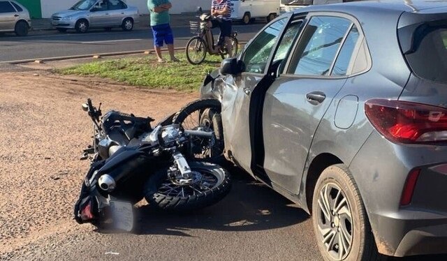 Moto e carro envolvidos em acidente no domingo, em Três Lagoas. (Foto: JP News)