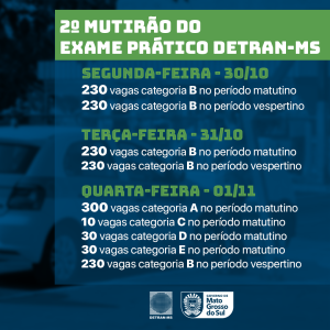 O Detran-MS (Departamento Estadual de Trânsito de Mato Grosso do Sul) abre na próxima sexta-feira (27) o agendamento para o segundo mutirão do exame prático que será realizado nos dias 30, 31 e 1° de novembro em Campo Grande.