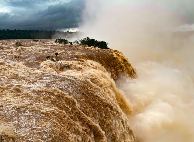Depois de ter registrado uma vazão de 24 milhões de litros por segundo nessa segunda-feira (30), o volume de água nas Cataratas do Iguaçu (foto), no Paraná, começou a diminuir nesta terça-feira (31), com vazão em 18 milhões e 100 mil litros d’água por segundo, registrados às 10h. Chuvas intensas atingiram a região nos últimos dias.