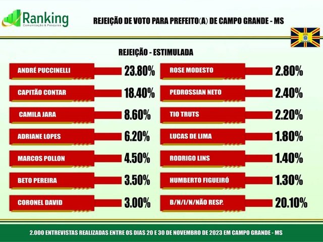 Na pesquisa de rejeição, o líder é André Puccinelli, com 23,8%, seguido pelo Capitão Contar, com 18,4%, por Camila Jara, com 8,6%, Adriane Lopes, com 6,2%, Marcos Pollon, com 4,5%, Beto Pereira, com 3,5%, Coronel David, com 3%, Rose Modesto, com 2,8%, Pedrossian Neto, com 2,4%, Tio Trutis, com 2,2%, Lucas de Lima, com 1,8%, Rodrigo Lins, com 1,4%, e Humberto Figueiró, com 1,3%, sendo que 20,1% não sabem ou não responderam.