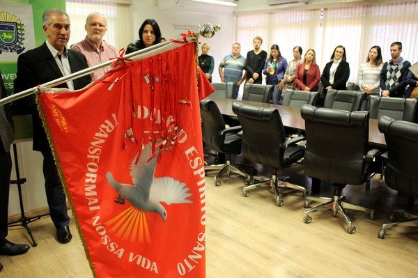Acompanharam a bandeira no gabinete, o deputado estadual Felipe Orro, que é padrinho da festa de Campo Grande; o presidente da Associação dos Amigos do Divino Espírito Santo de Campo Grande, Gilson Prazeres; e Luciane Souza, que é uma das coordenadoras do evento, entre outros.