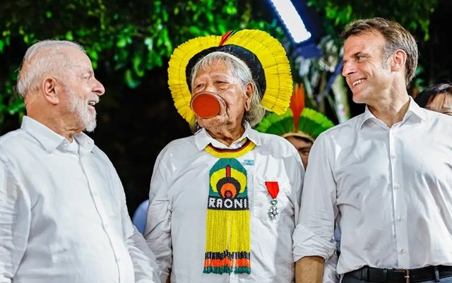 "Caro Raoni, esse momento é dedicado a você. Várias vezes você foi à França e eu me comprometi a vir aqui na sua floresta, estar junto com os seus. Essa floresta, que é tão cobiçada, mas que você sempre lutou para defendê-la durante décadas. O presidente Lula e eu, hoje, fazemos causa comum com um de nossos amigos", disse Macron em discurso antes de entregar a medalha ao cacique.