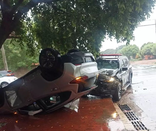 Motorista furou a preferencial, atingiu uma viatura da Polícia Civil e o Chevrolet Tracker que conduzia acabou capotando, na manhã desta sexta-feira (12), na cidade de Bonito, a 297 km de Campo Grande. O trânsito está parcialmente interditado.