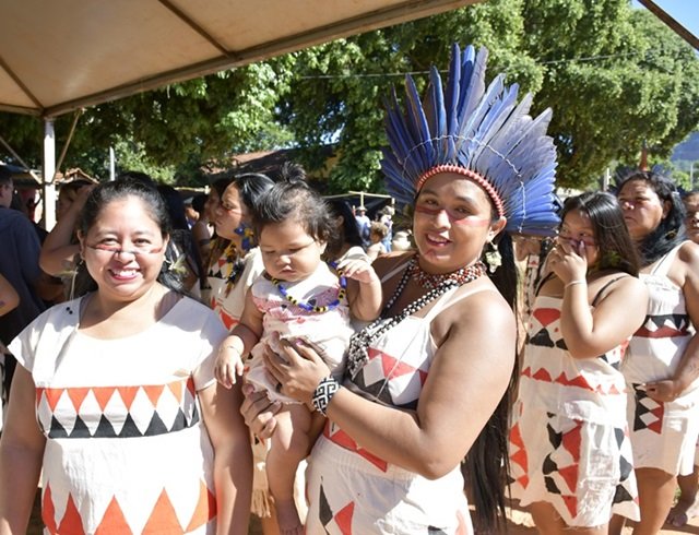 Tudo muito alegre e colorido, com apresentação de danças, pinturas e comidas típicas da cultura indígena terena.