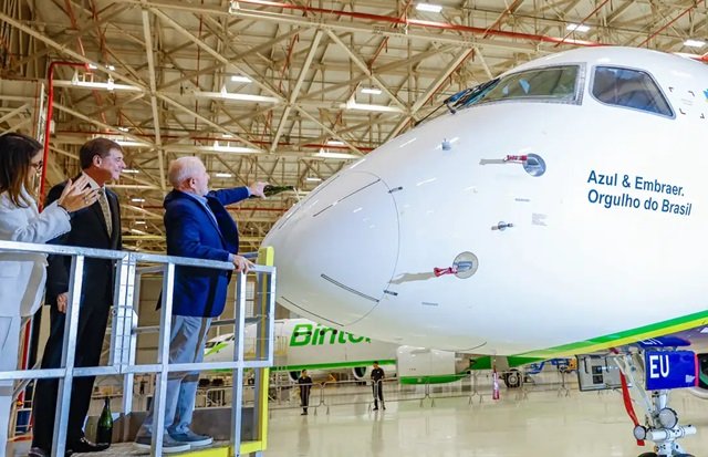 O presidente Luiz Inácio Lula da Silva visitou ontem, sexta-feira (26) o hangar da fábrica da Embraer, em São José dos Campos, no interior de São Paulo, onde acompanhou a entrega de um jato comercial modelo 195-E2, produzido pela companhia, para a Azul Linhas Aéreas.