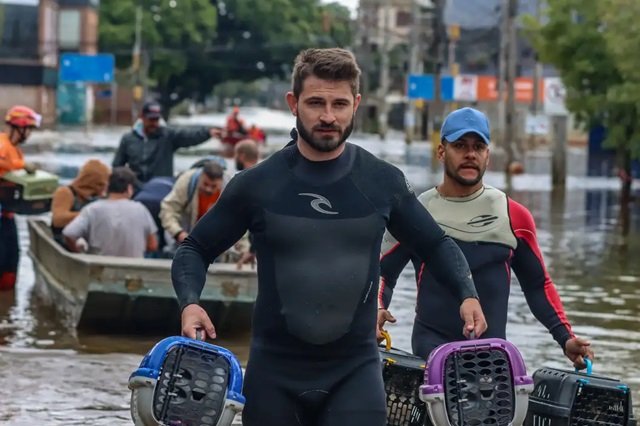 "Só hoje [sábado, 18], ainda retiramos 37 pessoas [da inundação]", afirma Edmilson Brizola, um dos voluntários. Morador da região, ele ajudou a coordenar a logística das embarcações que navegam ruas adentro. Ele calcula que, apenas nesse ponto, mais de 5 mil pessoas foram resgatadas, além de outros 2 mil animais, entre gatos, cachorros, galinhas, cavalos, aves e até porcos.