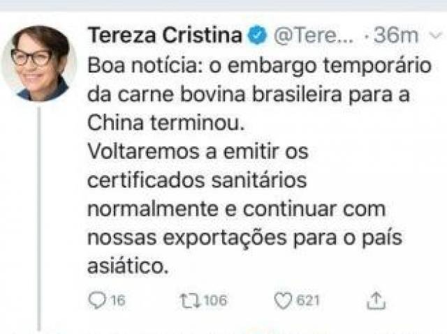 O governo brasileiro retirou embargo às exportações de carne bovina do País para a China, após uma suspensão temporária devido a um caso da doença da vaca louca no Mato Grosso. O anúncio foi feito pela ministra da Agricultura, Tereza Cristina, nesta quinta-feira (13) pelo Twitter.