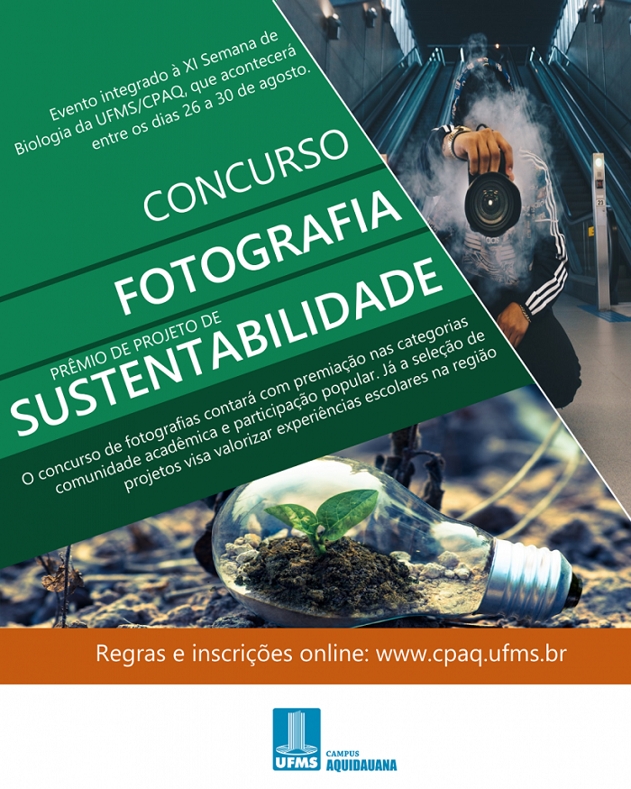Estão abertas as inscrições para os concursos de fotografia e de melhor projeto de sustentabilidade da região de Aquidauana (MS). A atividade está sendo promovida pelo Curso de Ciências Biológicas da UFMS, Câmpus de Aquidauana (CPAQ), como parte da XI Semana de Biologia, que será realizada em agosto.