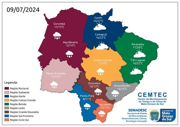 A mínima prevista em Campo Grande é de 11°C e a máxima de 15°C. No município de Dourados, a mínima é de 10°C e a máxima de 13°C. Na fronteira com o Paraguai, os termômetros em Ponta Porã marcam 8°C inicialmente e chegam aos 11°C. Anaurilândia, na região Leste, apresenta variação entre 14°C e 16°C.