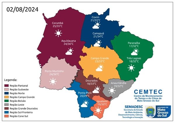 Já na região de Campo Grande, as mínimas devem ficar entre 21°C e 23°C, e as máximas entre 32°C e 34°C nos municípios que compreendem essa faixa.