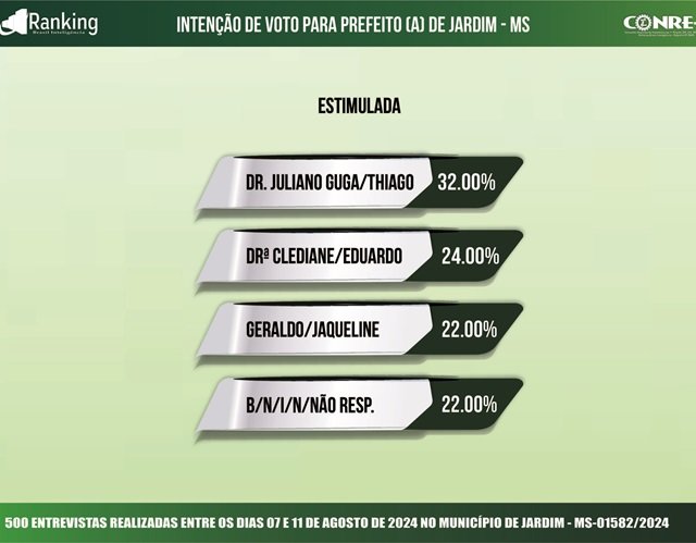 Pesquisa registrada no TSE (Tribunal Superior Eleitoral) sob o nº MS-01582/2024, encomendada pelo CNPJ: 03.955.300/0001-12, o Instituto Ranking Brasil Inteligência realizou, no período de 7 a 11 de agosto deste ano, junto a 500 moradores de Jardim (MS), com 16 anos ou mais de idade, a quarta pesquisa de intenção de votos para a Prefeitura Municipal nas eleições 2024, tendo intervalo de confiança de 95% e uma margem de erro de 4,3%, para mais ou para menos.