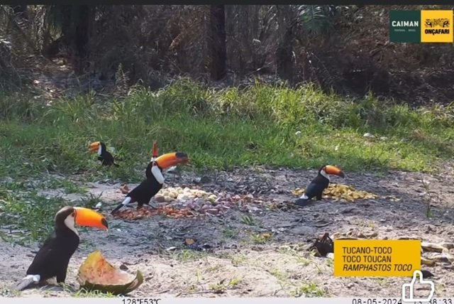 Sejam em bando ou isolados, os animais aparecem aproveitando as frutas, verduras e legumes deixadas pelas pessoas que trabalham no Onçafari. Em um dos cortes do vídeo, os macacos-prego são gravados comendo ovo, enquanto outro mostra os tucanos comendo o que parece ser uma melancia.