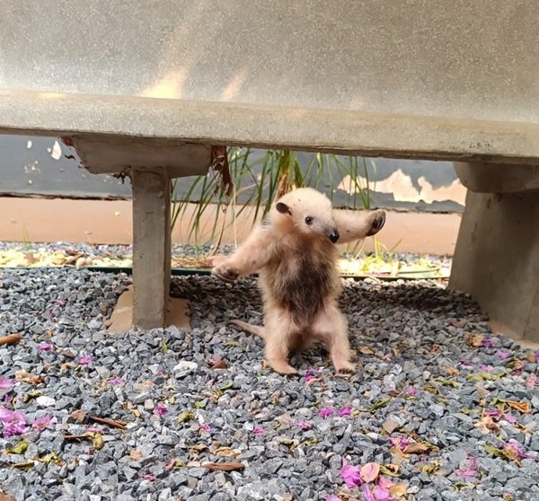 Muito assustado fora de seu habitat natural, perambulava nas proximidades da delegacia. A policial, sempre atenta e voluntária à causa animal, imediatamente resgatou o filhote tamanduá e providenciou a entrega à PMA de Jardim que irá encaminhar o animal para o CRAS (Centro de Reabilitação de Animais Silvestres) de Bonito MS.